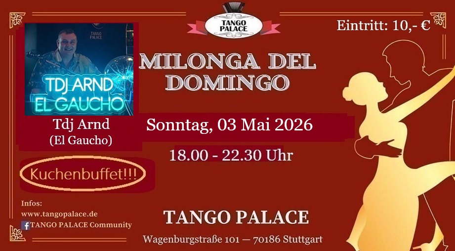 wir laden euch alle herzlich am Sonntag 26. April 2026 zu unserer MILONGA DEL DOMINGO ein. Tdj SERGIO SAUCET (Buenos Aires) kümmern sich um die beste Tangomusik und gute Laune!